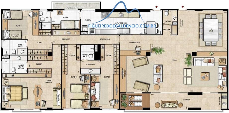 3 Dormitórios, sendo 3 Suítes3 Banheiros2 Vagas1 Copa1 Sala de TV1 Cozinha1 Lavabo1 Área de serviço1 Dependência p/empregada